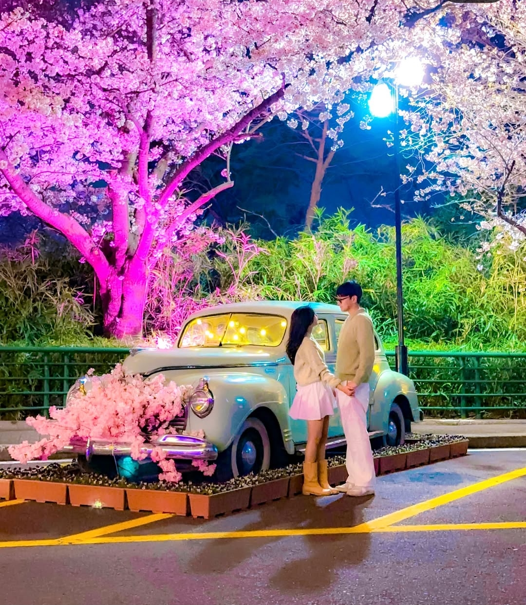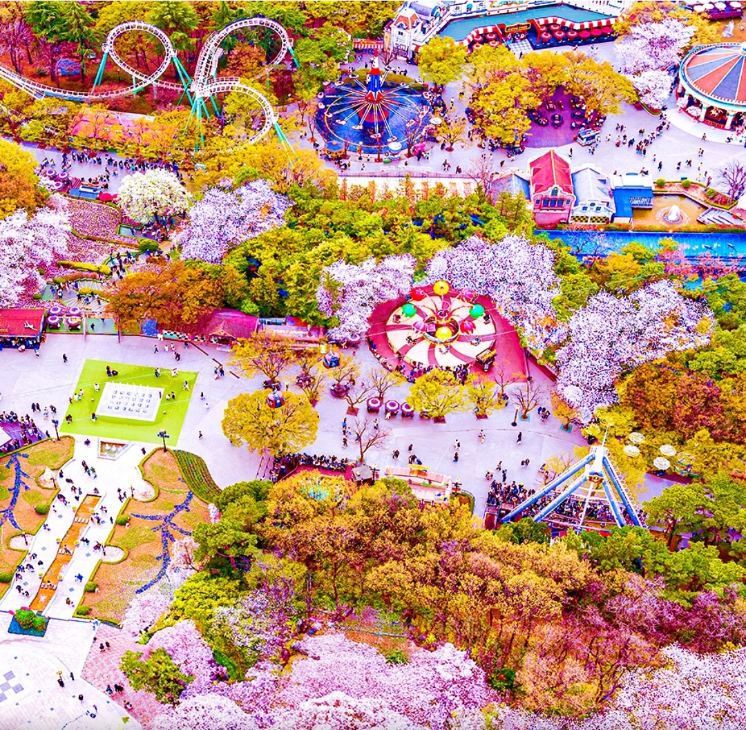해가 지면 더욱 아름다워지는 이월드! 벚꽃과 함께하는 화려한 조명쇼가 열려 昼夜(주야) 모두 색다른 분위기를 즐길 수 있습니다. - 피크닉 감성 가득한 포토존 📸