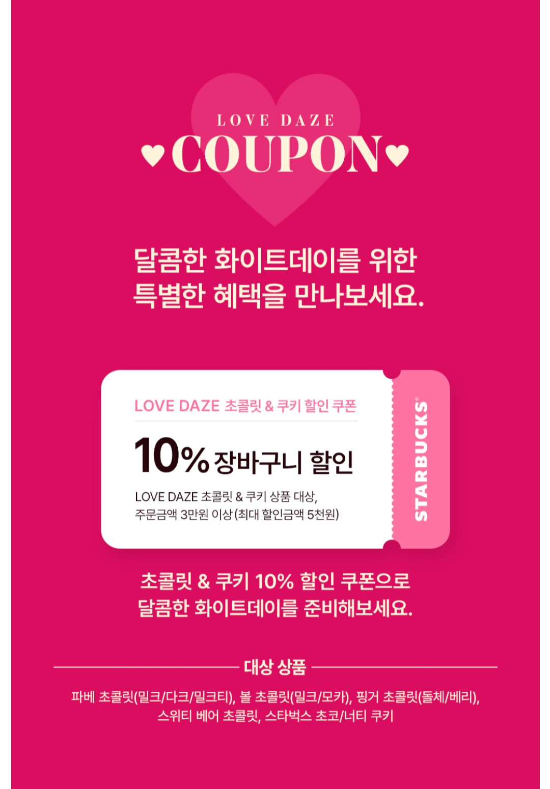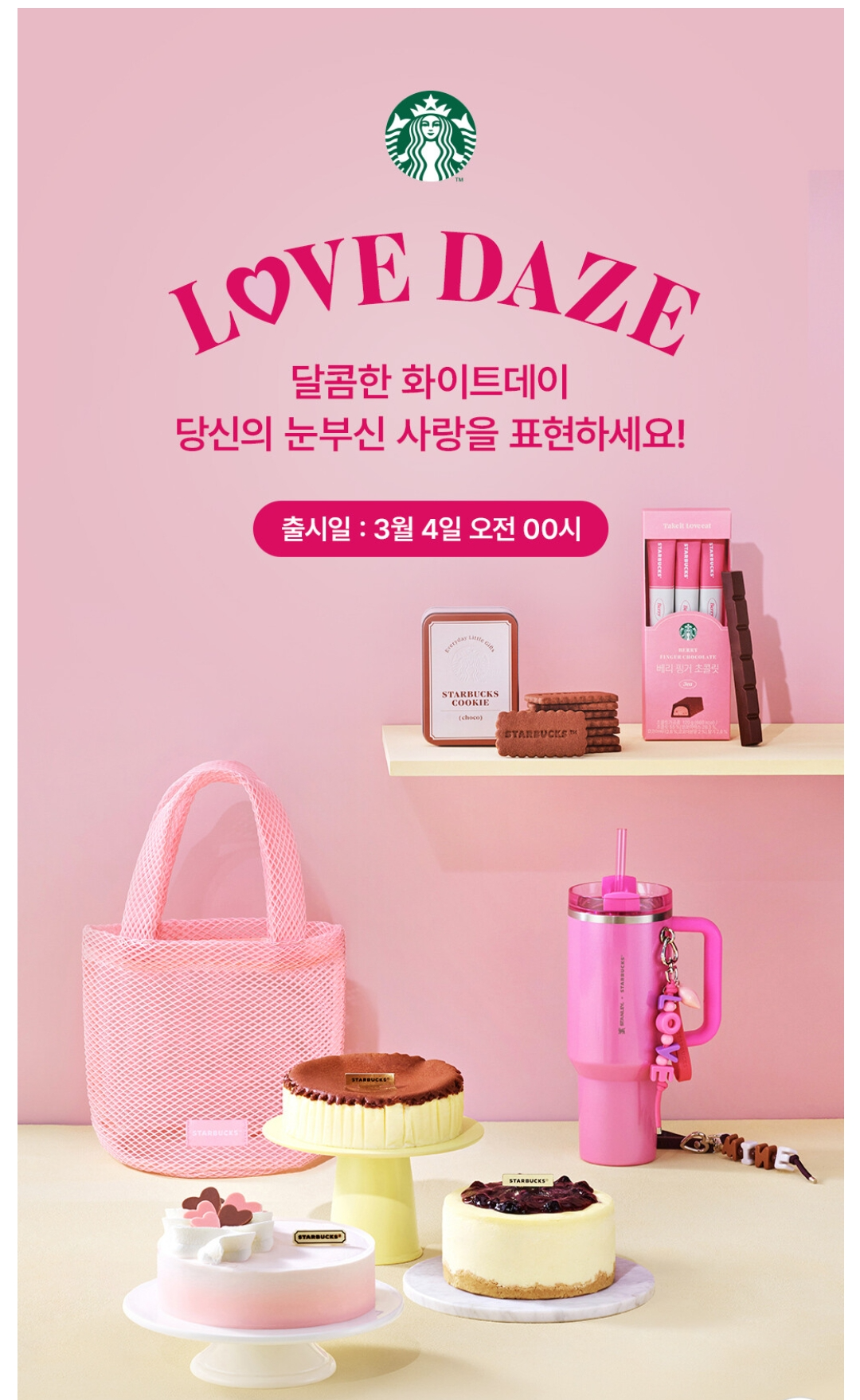 올봄, 사랑하는 사람과 함께 스타벅스에서 따뜻한 커피 한 잔과 달콤한 순간을 즐겨보는 건 어떨까요? ‘Love Daze’와 함께 더욱 특별한 화이트데이를 만들어보세요! 💕